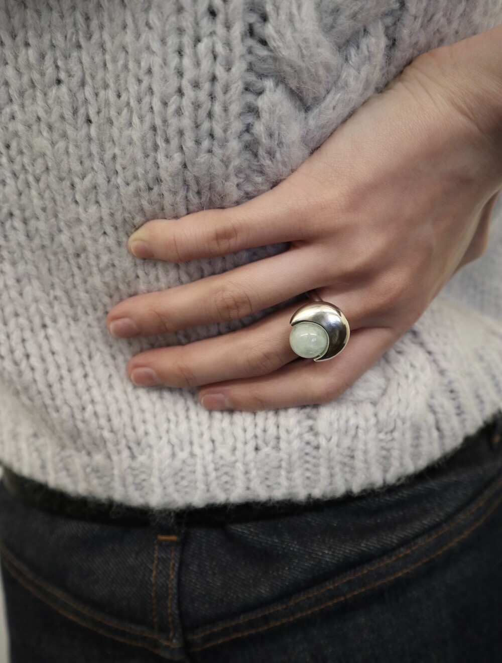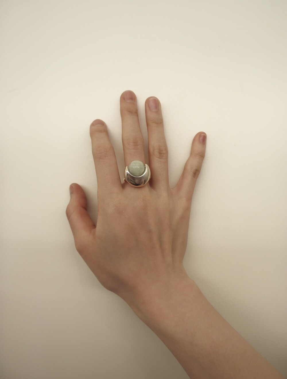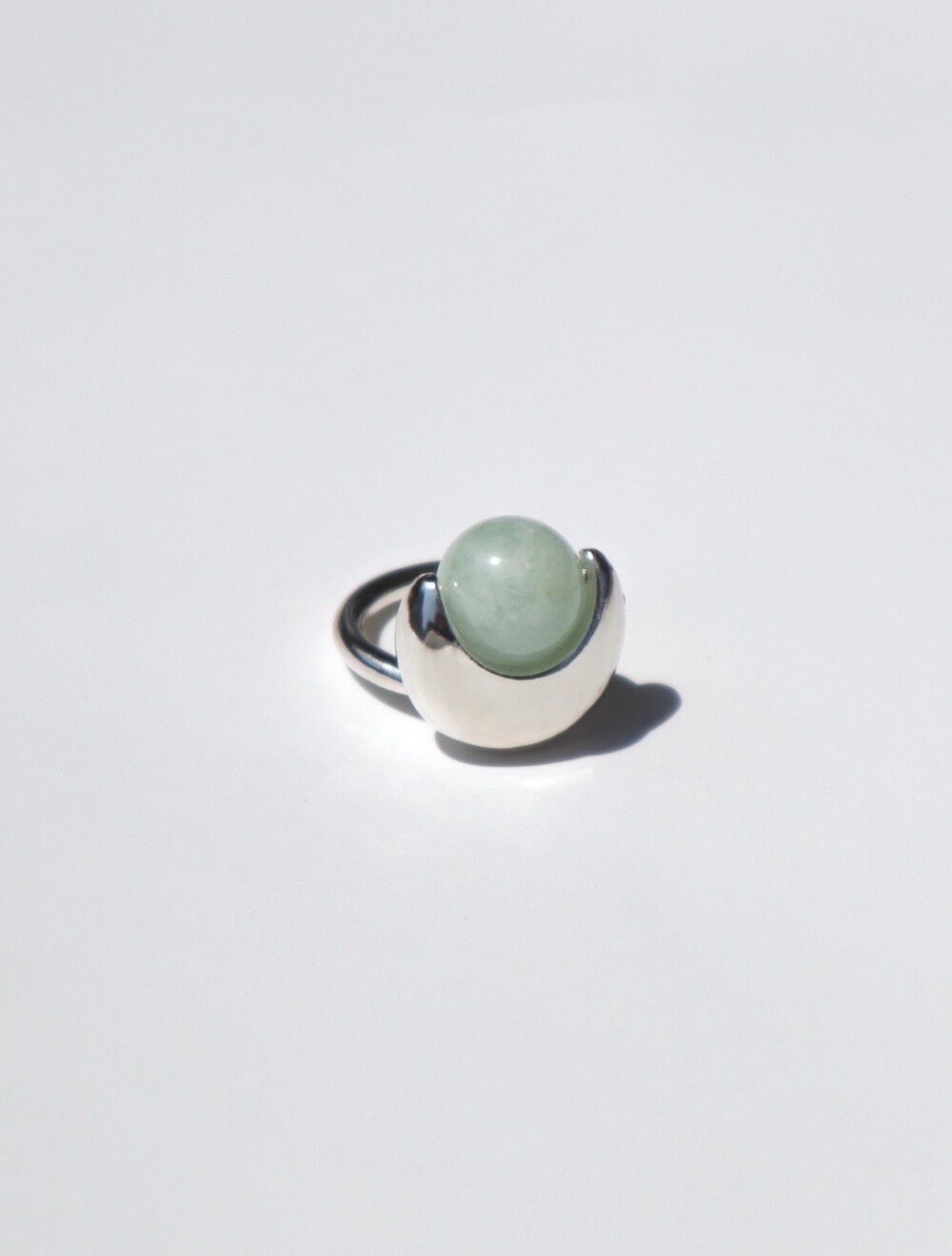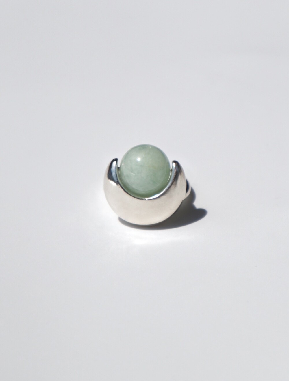 자유롭게 굴러가는 은은한 민트빛의 천연 원석 아쿠아마린을 감싸고 있는 초승달을 경험해 보세요.