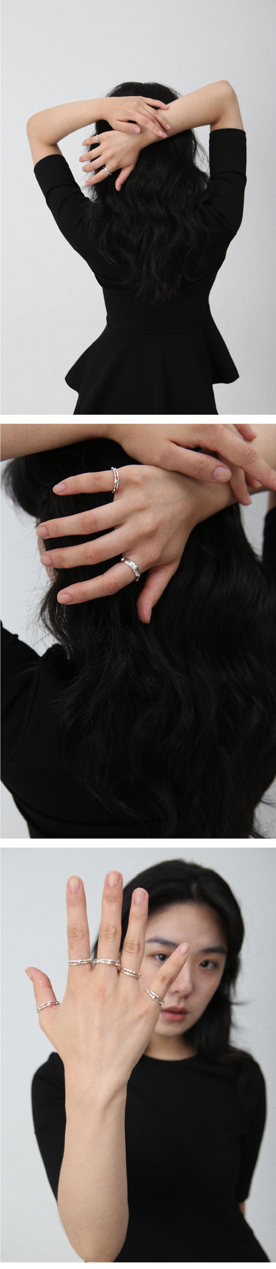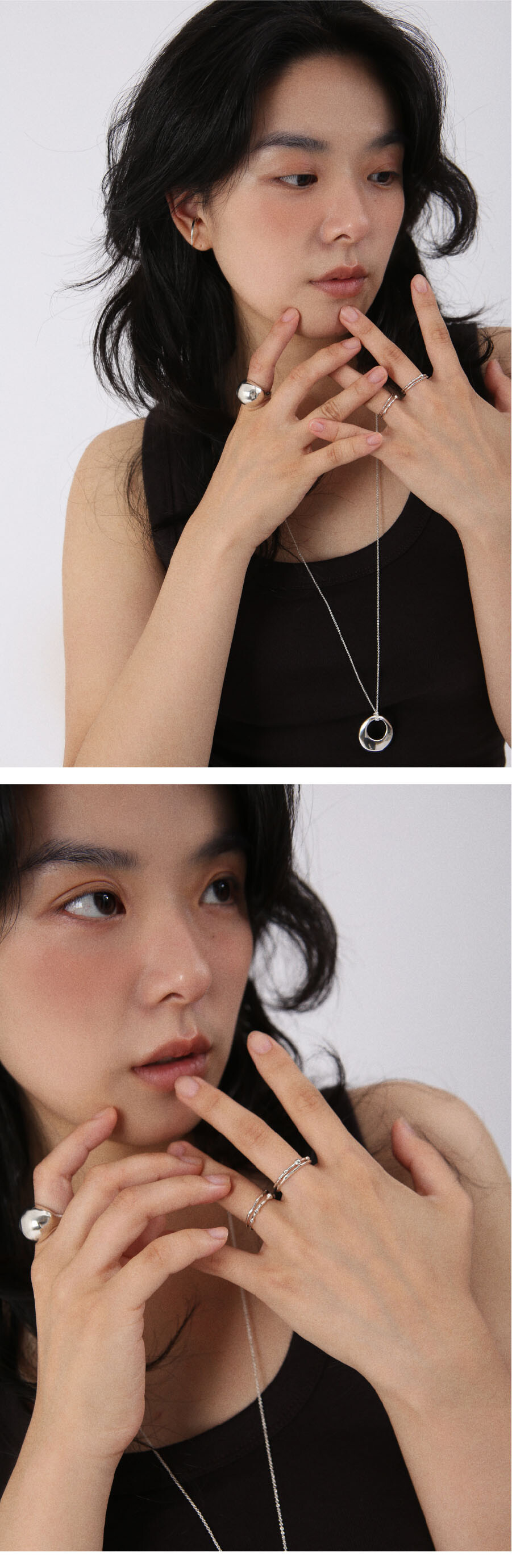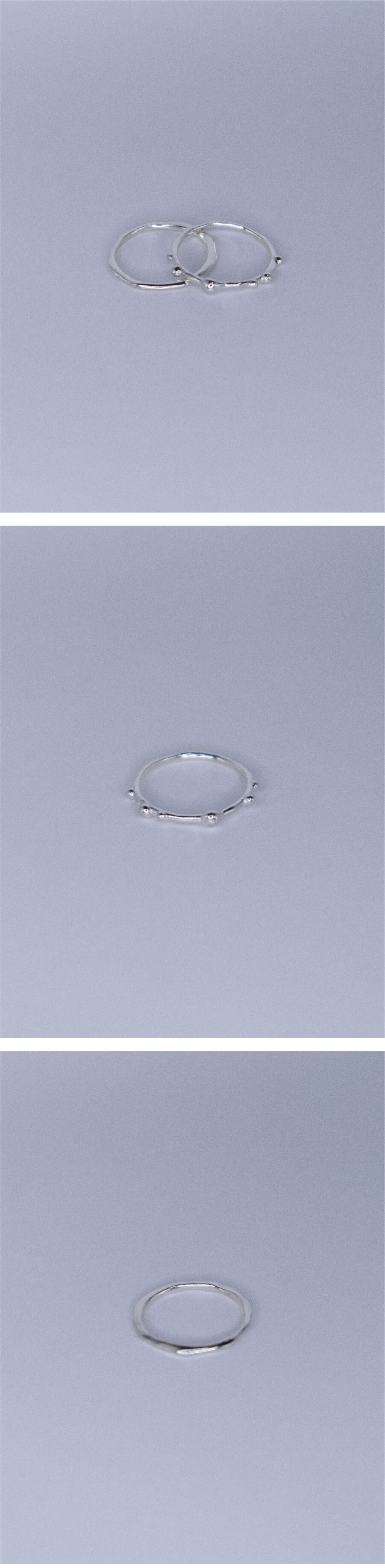 자연스러운 굴곡이 더해진 실반지와, 입체 원들이 흩어져 우아한 리듬을 만드는 반지.