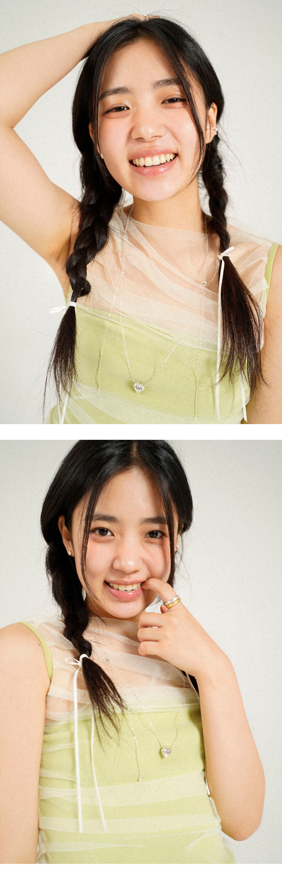 체인을 대칭 혹은 비대칭으로 원하는 모양과 길이로 조절하여 착용해주세요.