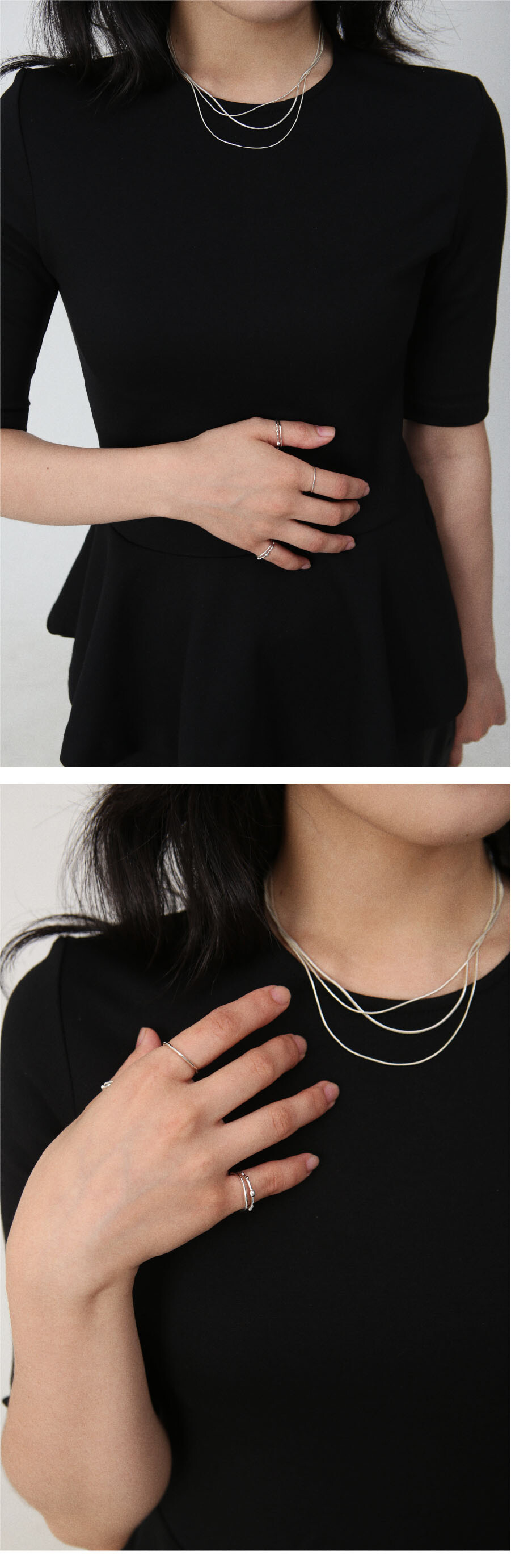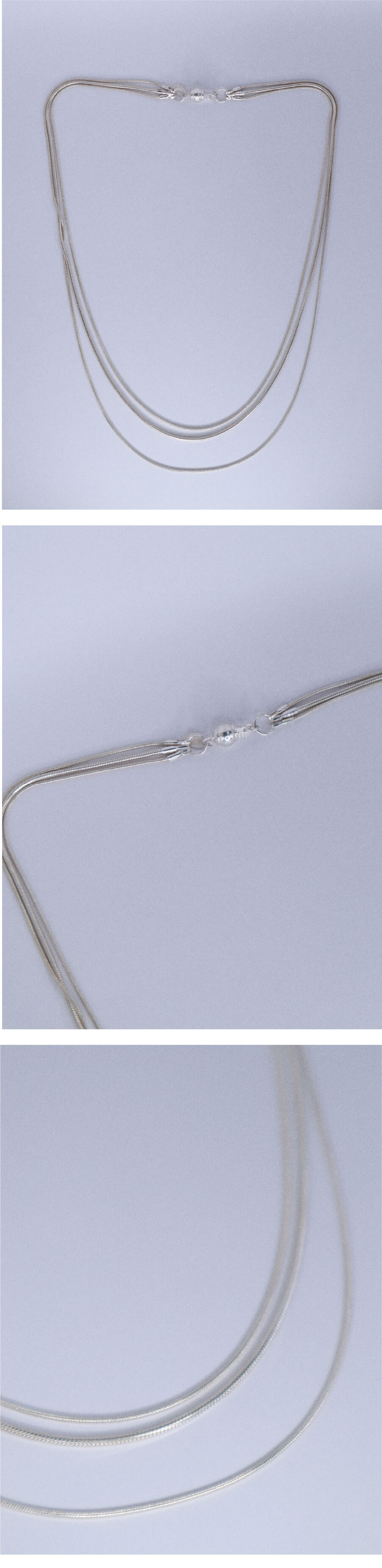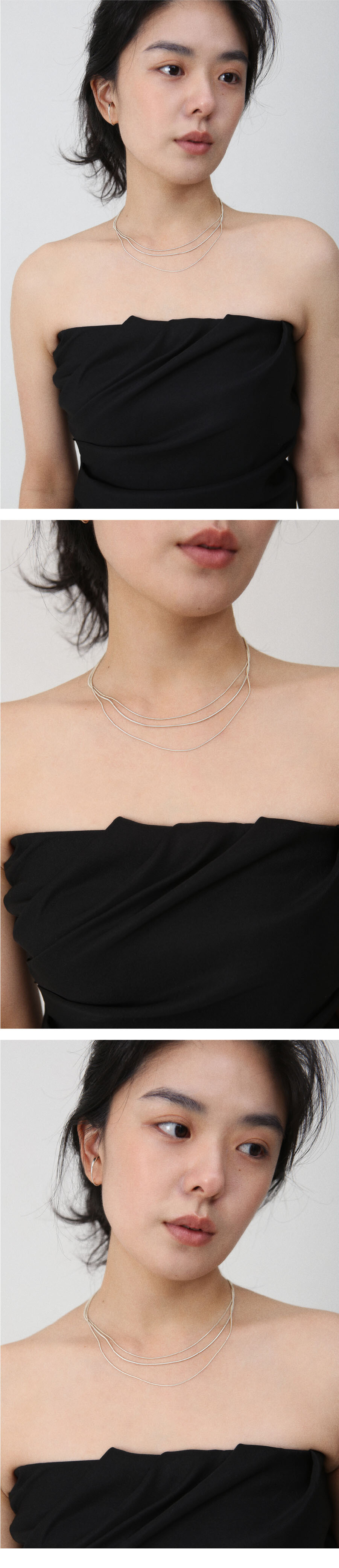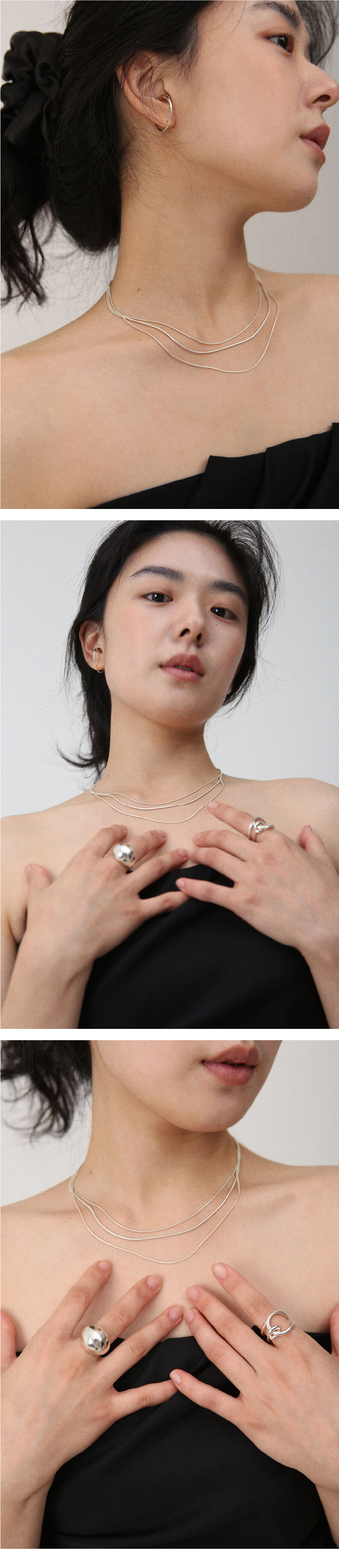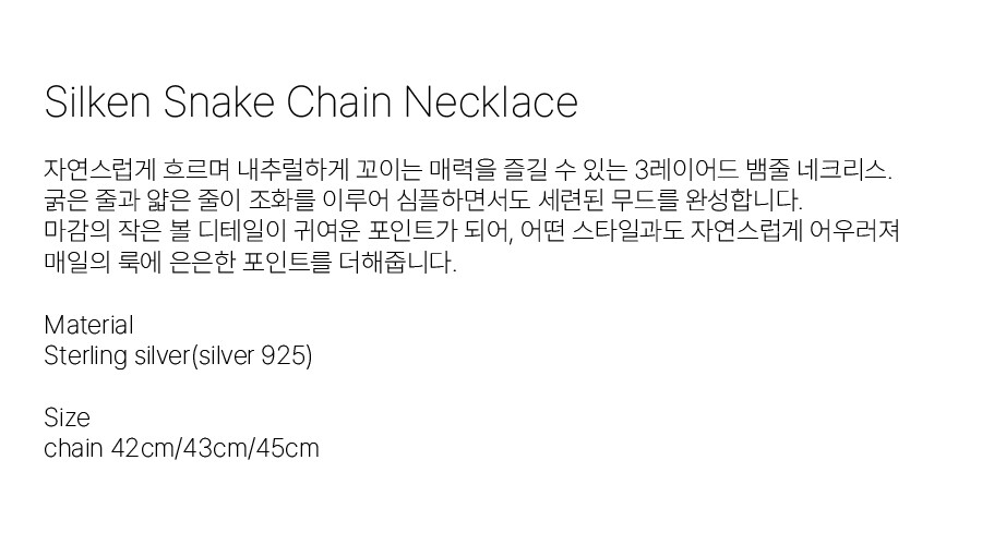 자연스럽게 흐르며 내추럴하게 꼬이는 매력을 즐길 수 있는 3레이어드 뱀줄 네크리스. 굵은 줄과 얇은 줄이 조화를 이루어 심플하면서도 세련된 무드를 완성합니다. 마감의 작은 볼 디테일이 귀여운 포인트가 되어, 어떤 스타일과도 자연스럽게 어우러져 매일의 룩에 은은한 포인트를 더해줍니다.