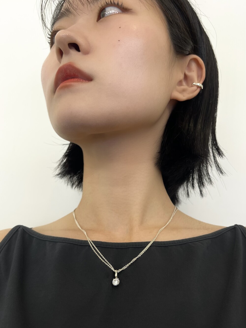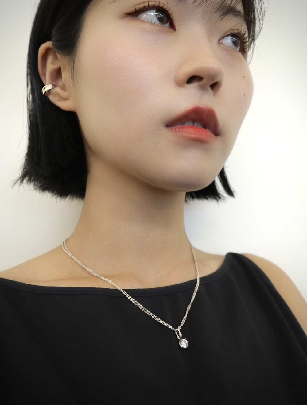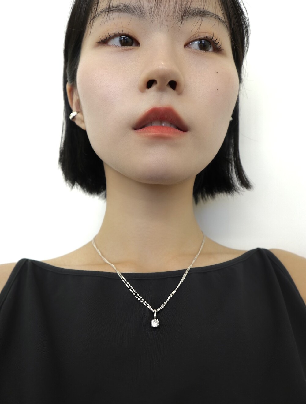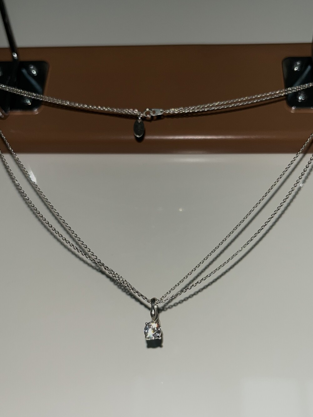 더블 체인과 비정형적인 팬던트 고리가 인상적인 큐빅 네크리스입니다.