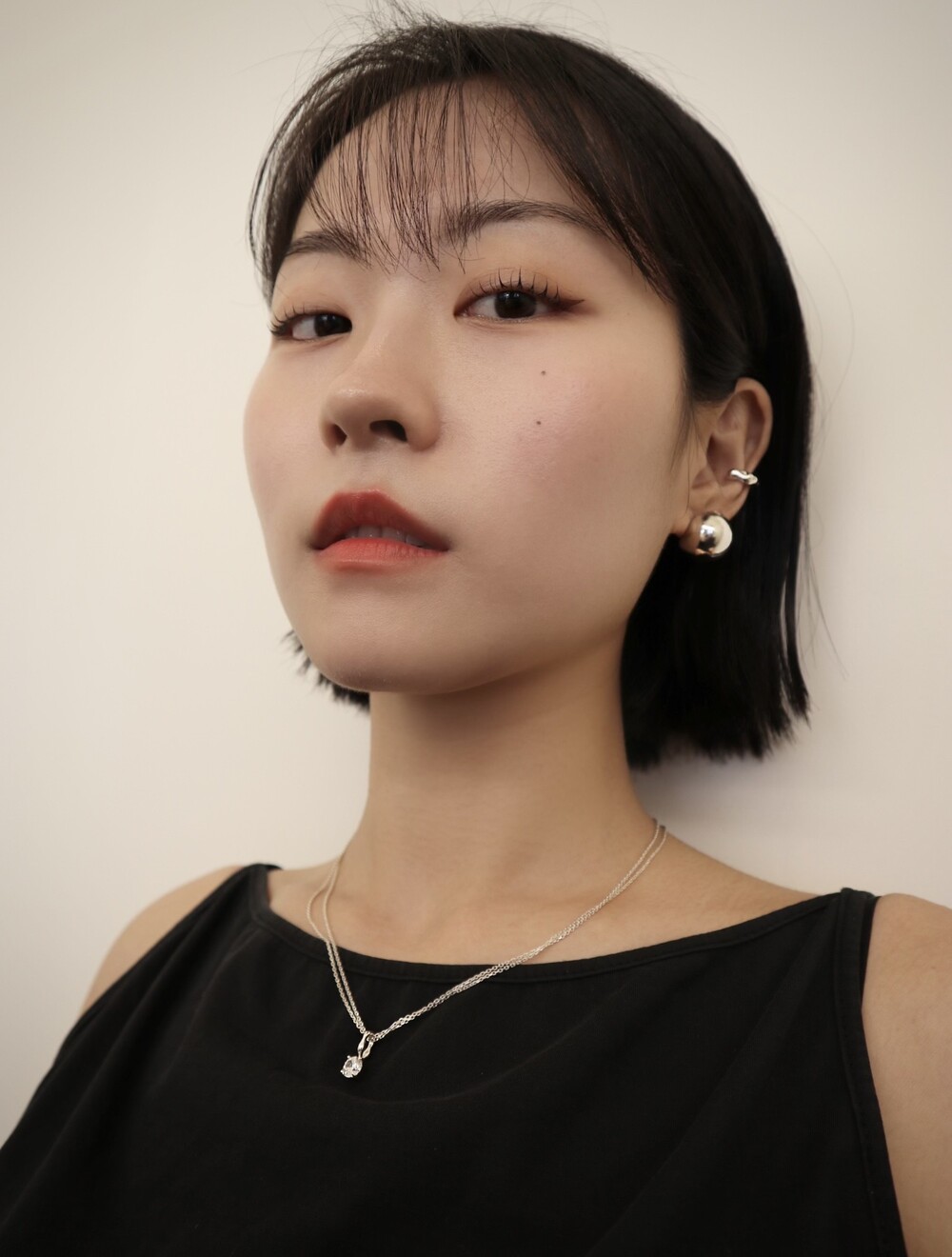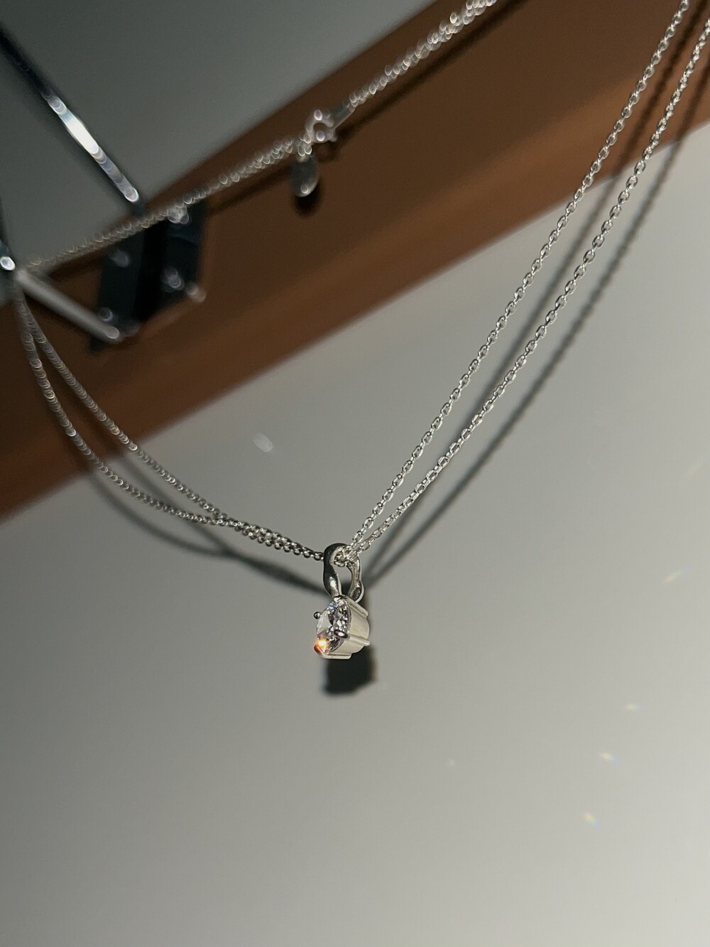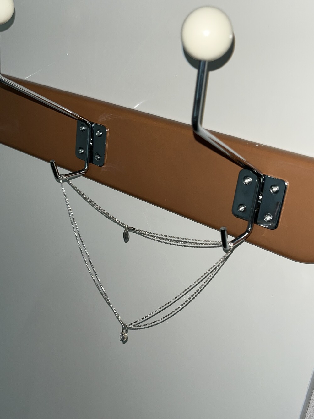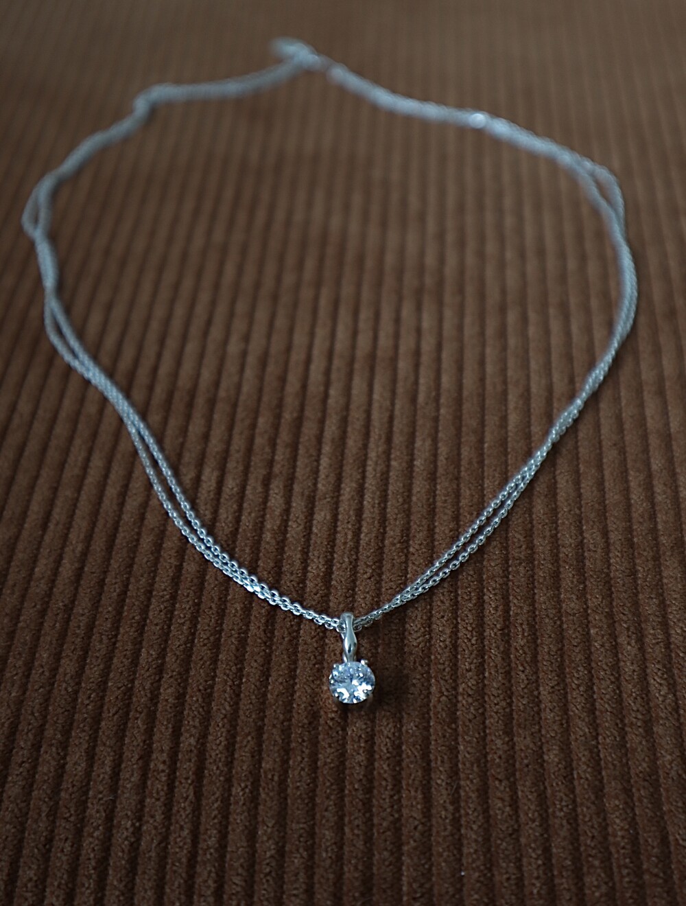 더블 체인과 비정형적인 팬던트 고리가 인상적인 큐빅 네크리스입니다.